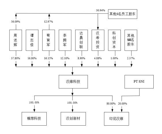 根据汉维科技的股权架构,公司控股股东为周述辉,共同实际控制人为周述辉、谭志佳、荀育军、李拥军。周述辉占公司股本总额的37.80%,谭志佳占公司股本总额的16.80%,荀育军占公司股本总额的16.15%,李拥军占公司股本总额的12.10%。达晨创联作为投资机构,占公司股本总额的8.90%。